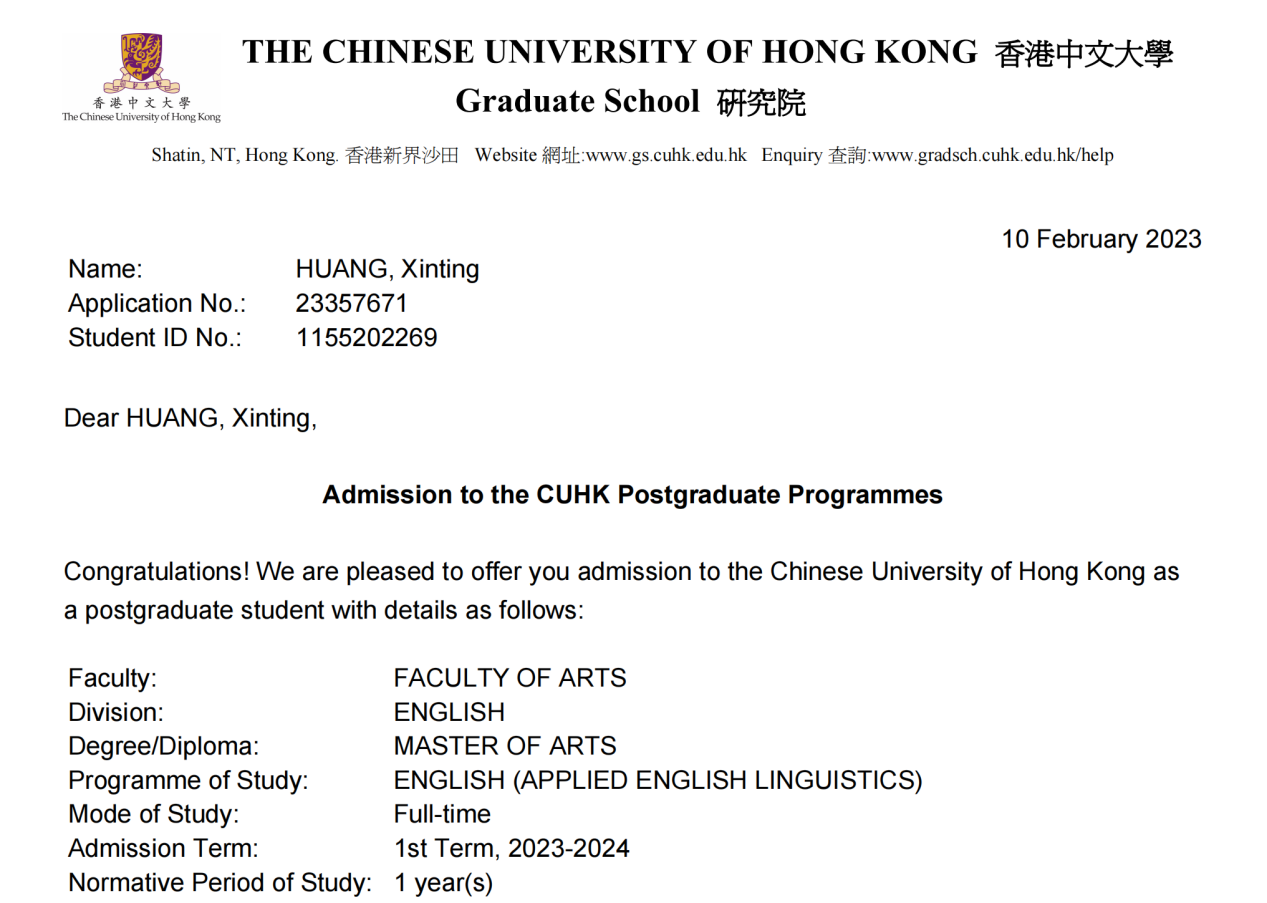 憑借實力,今年1月6日,香港中文大學通知她獲得面試機會,六天后面試。面試結束第二天,她收到推研信。一個月后,她如愿收到香港中文大學碩士的正式錄取通知書,攻讀應用語言學專業。